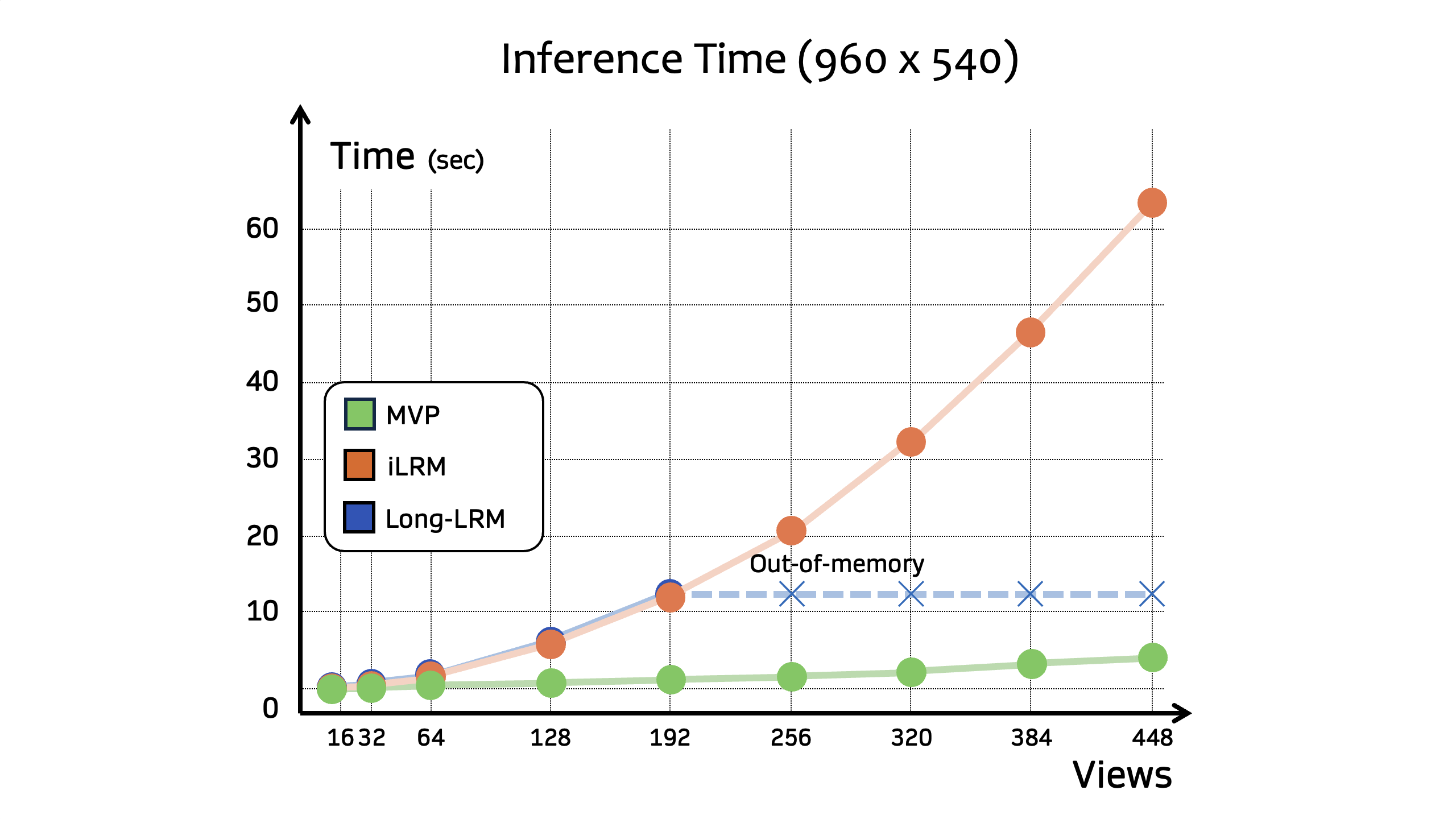 We compare MVP against recent feed-forward 3D reconstruction methods, Long-LRM, and iLRM. We evaluate the methods on in-domain dataset, DL3DV, and out-of-domain datasets, Tanks&Temples and Mip-NeRF360. The resolution of input images is 960x540 for all methods.
