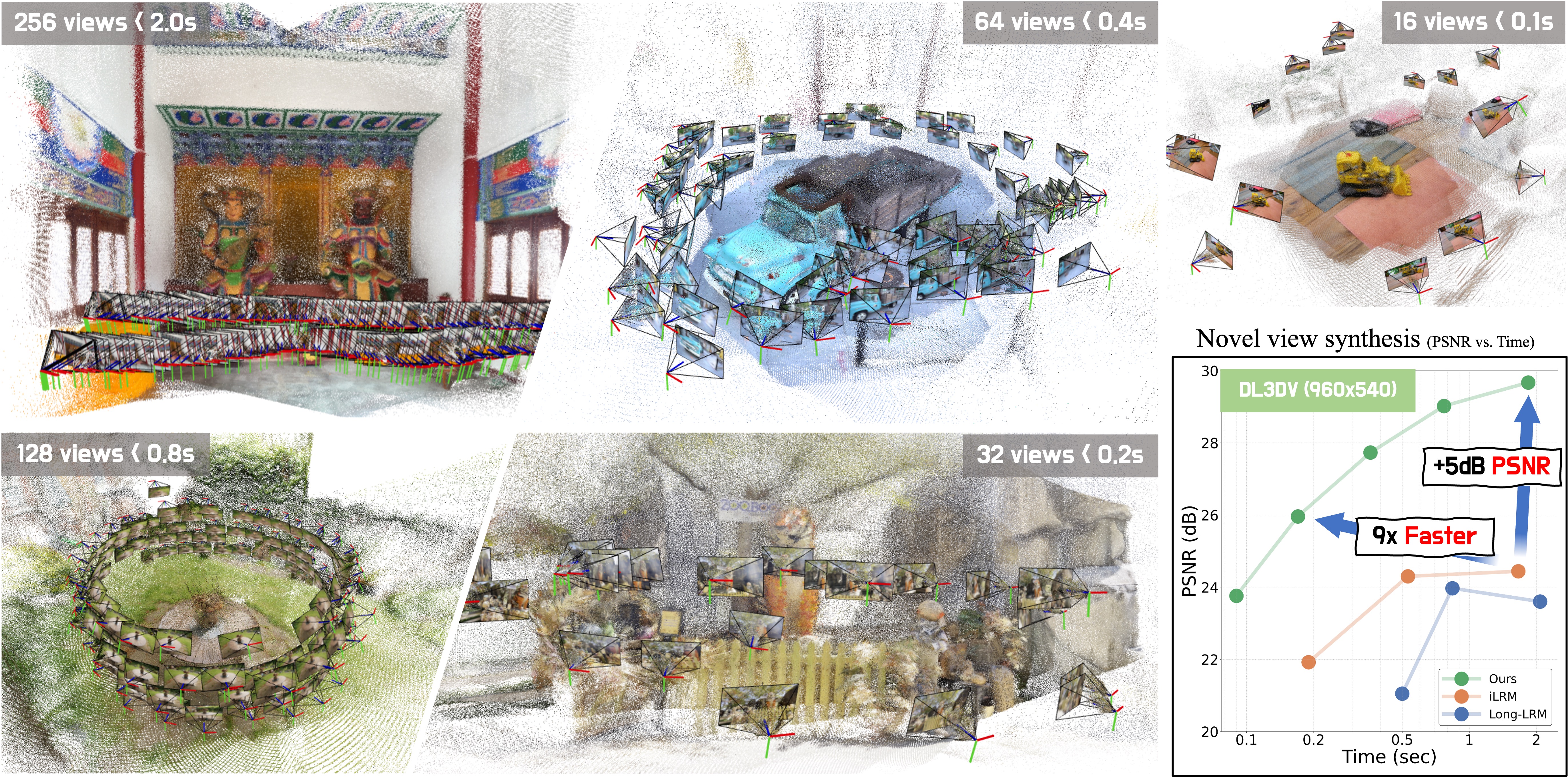 We compare the inference time as a function of the number of input views. We measure all timings at an input resolution of 960x540 on a H100 GPU. Note that the inference time only accounts for the generation of 3D Gaussians. For novel view rendering, Long-LRM encounters a memory error when using more than 192 input views.